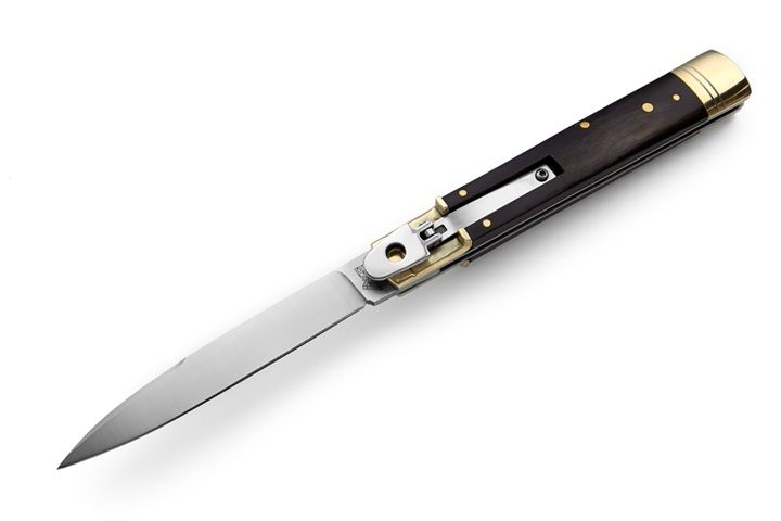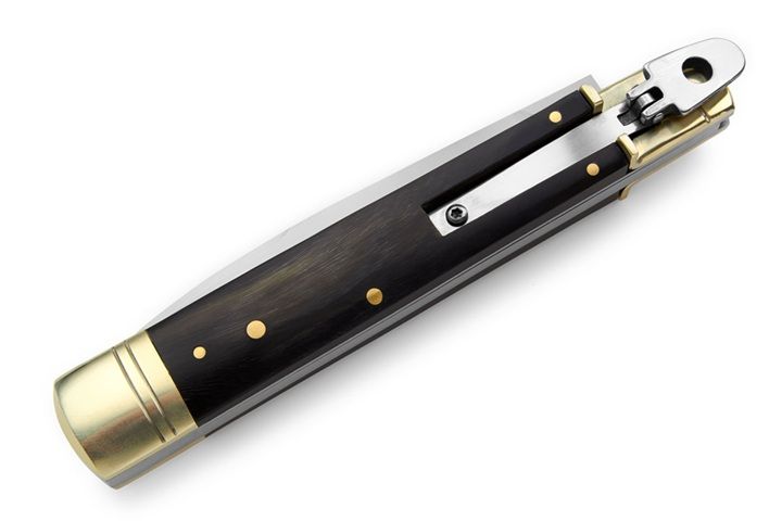 AKC-WORLD Buffalo Horn Slim Lever Lock Automatic Knife Flat Blade. A variation of the AKCW classic 9” leverlock knife. This is the slim one. Suggested for everyday use. It's a side opening automatic switchblade. Stainless steel bolsters and Buffalo horn scales on this one. Note: as it is a natural material, colour, texture and pattern will vary from knife to knife. Overall Length: 23cm - 9" Blade Length: 9.2cm - 3.62" Blade thickness: 2,7mm - 0.11" Weight: 150 gr-5.29 oz Blade Material: Stainless steel 440 A Handle Material: Buffalo horn Frame Material: Brass