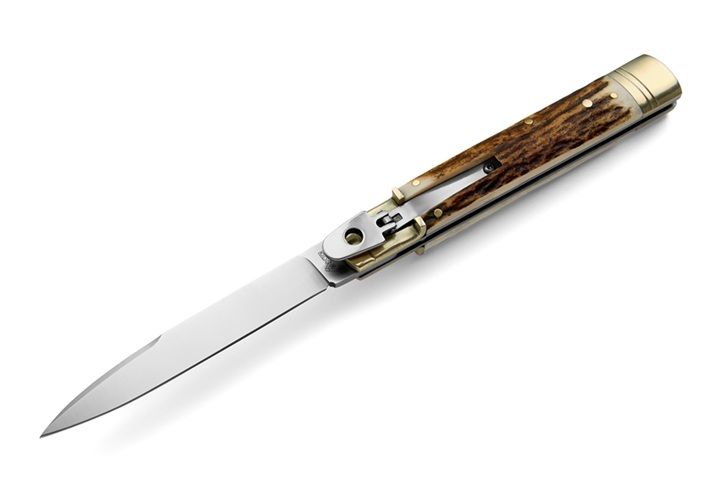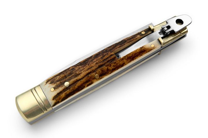 AKC World Stag Horn Slim Lever Lock Automatic Knife Flat Blade. A variation of the AKCW classic 9” leverlock knife. This is the slim one. Suggested for everyday use. It's a side opening automatic switchblade. Stainless steel bolsters and Stag horn scales on this one. Note: as it is a natural material, colour, texture and pattern will vary from knife to knife. Overall Length: 23cm - 9" Blade Length: 9.2cm - 3.62" Blade thickness: 2,7mm - 0.11" Weight: 161 gr-5.68 oz Blade Material: Stainless steel 440 A Handle Material: Stag horn Frame Material: Brass