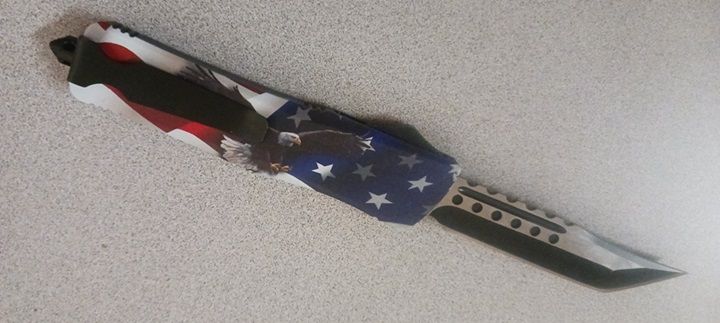 American Eagle USA Flag D/A OTF Automatic Knife Two Tone Tanto. The American tanto style blade is constructed of stainless steel and features a two-tone black and silver finish. Included with your purchase is a black nylon sheath that you can attach to your belt for easy carry. Overall Length: 9.5 Inches, Blade Length: 3.75 Inches