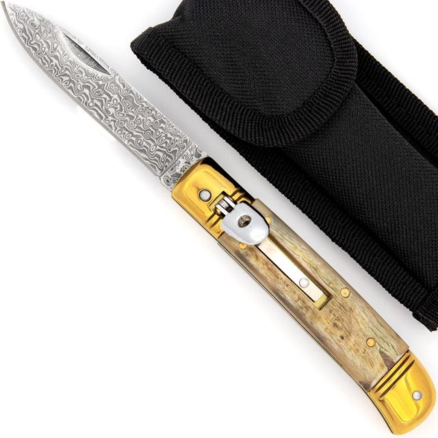 Automatic Land to Surf Raw Ram Horn Gold Lever Lock Switchblade Knife. Each one of the Land to Surf Lever Lock Switchblades come with a black nylon sheath for easy storage and carry. Overall Length: 4.5 inches (closed). Weight: 0.25 lbs.