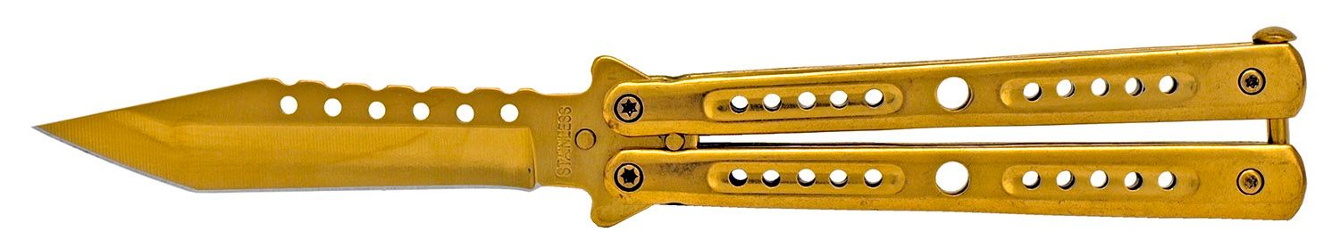 Balisong 9 Inch Gold Heavy Folding Butterfly Knife Tanto. This flipper has an overall weight of 5 ounces with a 440 stainless steel 3.5 inch blade. Good overall construction on this all metal knife.