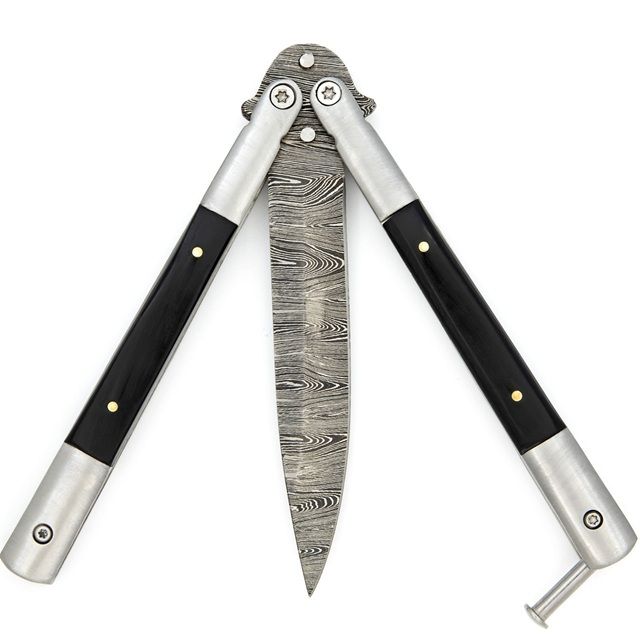 Best Price Heavy Duty Black Butterfly Knife Damascus Blade Drop Point. This Black Steel Balisong Butterfly Knife is a reliable, well-balanced addition to any knife reseller’s inventory. Measuring 8.75 inches overall, it features a black anodized stainless steel blade and a solid steel handle for long-lasting performance. The safety latch locks the blade in place during carry or storage. Ideal for training, flipping practice, or tactical purposes, it’s a versatile product that appeals to collectors, martial artists, and outdoor enthusiasts alike. Specifications: Overall Length: 8.75 Inches Blade Length: 4 Inches Blade Material: Stainless Steel; Anodized Black Finish Blade Thickness: 2.13 mm Handle Length: 4.75 Inches Handle Material: Stainless Steel, Black Features: Black Blade Finish for Tactical Appeal Heavy-Duty Steel Handle Functional Safety Latch Excellent for Flipping or Display