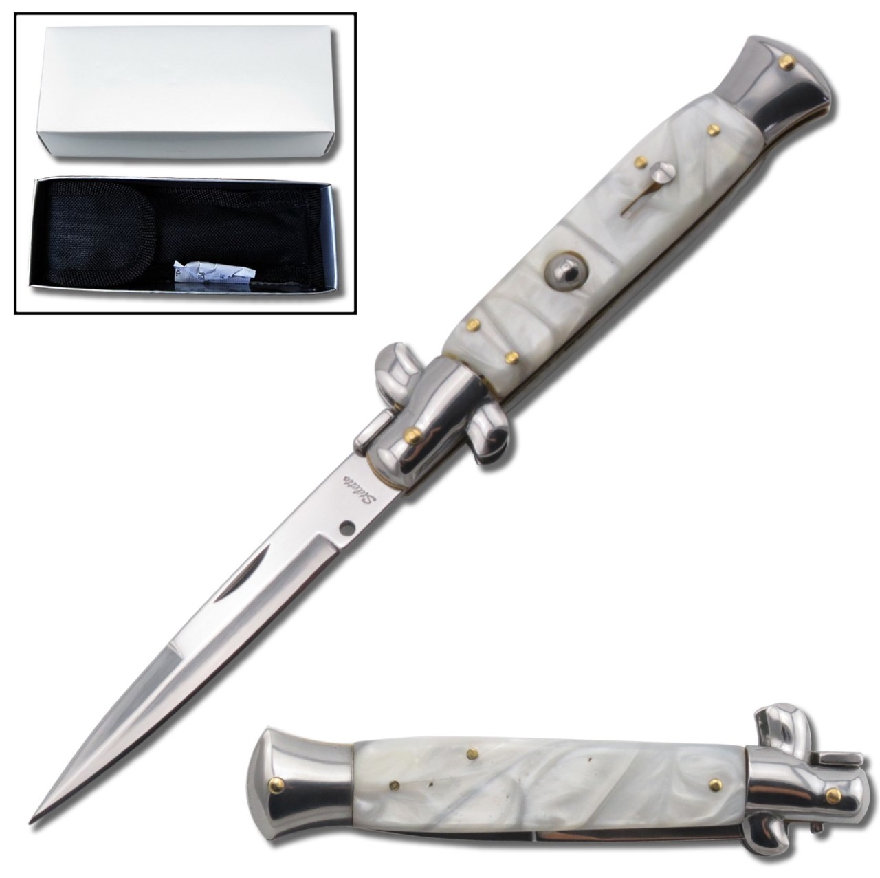 Best Value White Pearl Milano Stiletto Automatic Knife (9.75" Overall). If your looking for a perfect gift to give to someone inexpensively, this is it! These stilettos are made with the word stiletto stamped into the blade. These are better built with a little heavier construction than the normal chinese made versions. 9.5 Inches total length with a 4 inch 440 stainless steel blade.