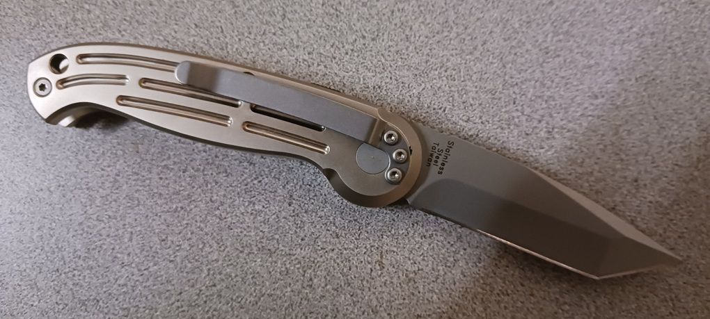Boker Magnum Mini Satin Tanto Automatic Knife Champagne. This knife looks fierce with its magnum tanto, corrosion-resistant coating blade. The knife pops out of the handle with a lot of force. The Boker Magnum Auto Series is made by knife craftsmen in one of the most respected knife factories in the world. Boker engineered this knife in Germany, had it made in the Taiwan workshop, then American craftsmen finished them out into one of the highest quality international knives produced. Handle: Lightweight Aluminum Blade: 2.75 Inch bead blast blade of 420 stainless steel Push button locking system Overall open length: 6.25" Weight: 2.4 ounces