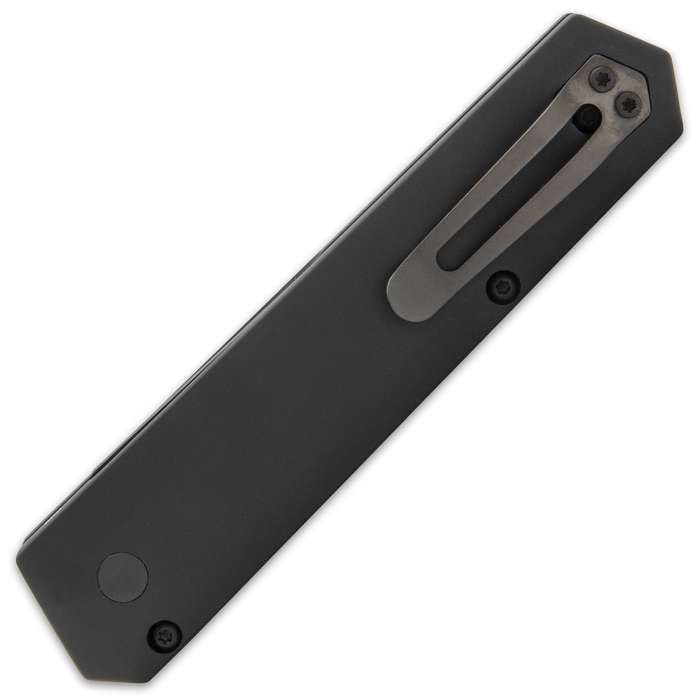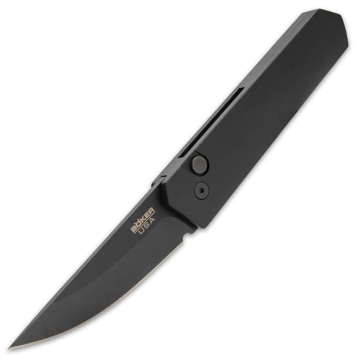 Boker Plus Kwaiken Black Mini Automatic Knife Black Drop Point. The popularity of the Kwaiken resulted in cooperation with the renowned automatic knife specialist Pro-Tech in California It has a 3” 154CM steel blade with a black DLC coating and it can be quickly deployed with the push button It has a black, CNC-milled aluminum handle with a push button lock and a tip-up pocket clip for ease of carry