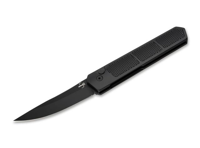 The Evolution of an Icon The Boker Plus Kwaiken Grip Auto, designed by renowned U.S. knifemaker Lucas Burnley, represents the next stage in the evolution of one of the most influential modern knife designs. Known for its clean lines, slim profile, and flawless balance, the Kwaiken has become a true icon in the knife world - and this automatic version elevates it to tactical perfection. The coated D2 steel blade opens lightning-fast at the push of a button, delivering exceptional edge retention, strength, and reliability in the field. The lightweight aluminum handle, also coated for durability, features non-slip texturing for a secure grip even under demanding conditions. Designed to meet the high standards of tactical professionals and EDC enthusiasts, the Kwaiken Grip Auto includes a concealed lanyard hole, a tip-up (right-hand) pocket clip, and a premium nylon case for secure storage. Sleek, fast, and functionally refined - the Kwaiken Grip Auto continues Lucas Burnley’s legacy of purposeful precision. Brand: Boker Plus Type: Pocket Knives Overall Length: 8.07 in Blade Length: 3.35 in Blade Thickness: 1.26 in Weight: 3.17 oz Designer: Lucas Burnley Blade Material: D2 Handle Material: Aluminum Opener: Push Button Opening: Automatic Lock Type: Push Button Color: Black Blade Color: Black Item Number: 01BO474