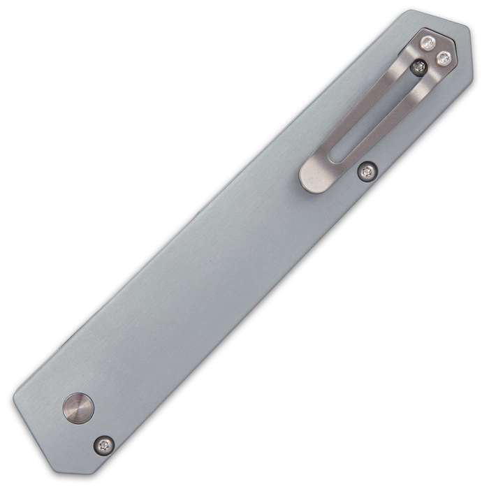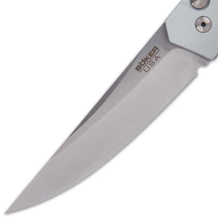 Boker USA Plus Kwaiken Automatic Knife Silver. The Kwaiken, designed by custom knifemaker Lucas Burnley, continues to be one of the most successful projects from Boker Plus The 3 1/2”, blade is made out of the US-made 154CM steel with a stonewash finish and provides high edge retention The perfect action of the push button automatic makes opening a breeze, and the strong spring delivers an impressive kick The silver, CNC-milled aluminum handle is robust and features a pocket clip for ease of carry