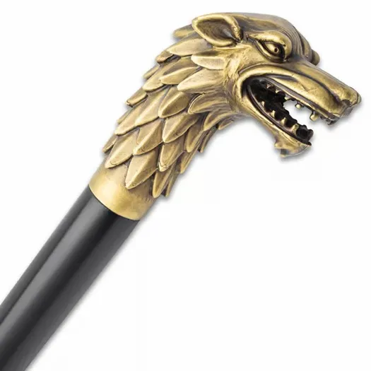Brass Head Wolf Cane Solid Sculpted Brass. The Brass Head Wolf Cane makes a ferocious and eye-catching accessory to your wardrobe. The solid brass handle is expertly sculpted with fine detail in the shape of a growling wolf. The black shaft has a tough TPU construction with a hard plastic toe. The 37 1/2” overall cane is not only attractive but is solid enough that, in a pinch, it can be used as a self-defense weapon. The Brass Head Wolf Cane makes a ferocious and eye-catching accessory to your wardrobe The solid brass handle is expertly sculpted with fine detail in the shape of a growling wolf The black shaft has a tough TPU construction with a hard plastic toe