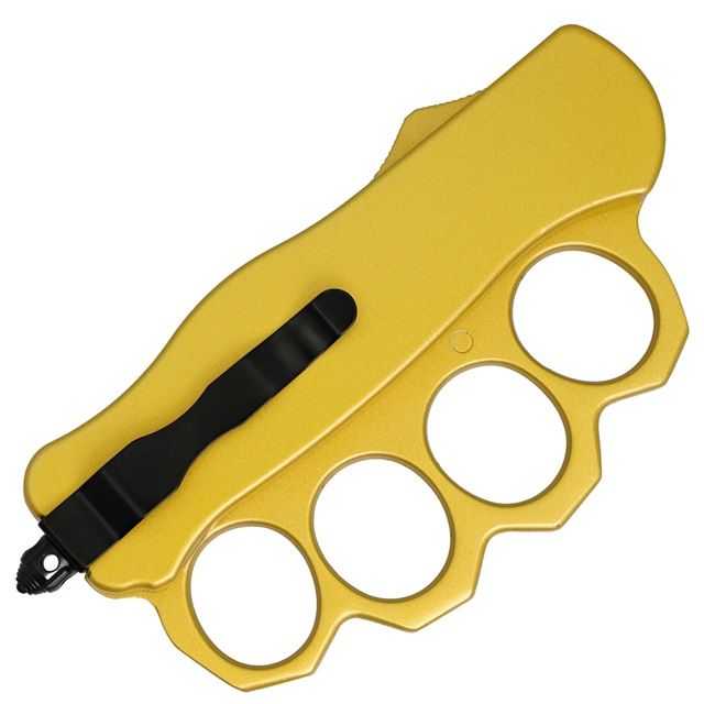 Carbon Fiber Gold D/A OTF Trench Automatic Knuckle Knife Dagger is an out the front trench style knife which means it is an OTF with a knuckle attached to the handle. This piece is mostly gold with patterned carbon fiber inlays on one side of the handle. The blade is black anodized and double edged with a fuller on both sides and 4 cutouts along the center of the blade to lower and distribute weight for a balanced piece. Included is a nylon sheath equipped with a belt loop for easy carry. Overall Length: 9.25 Inches. Weight: 1.05 lbs.