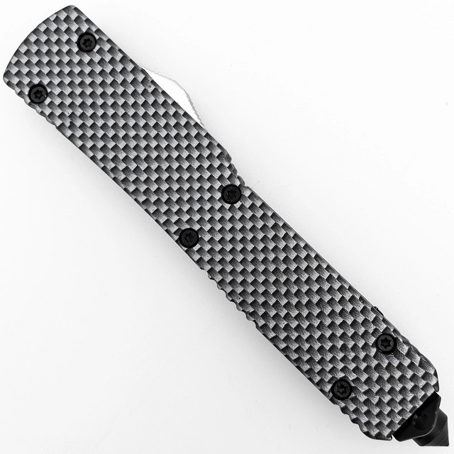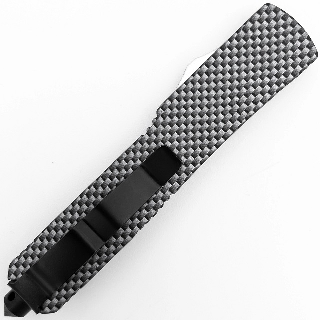 Checkered Flag D/A OTF Automatic Knife Two Tone Dagger. The blade is constructed from stainless steel with a two-tone finish and spear point style. Circular fullers run half along the blood groove of the blade. carbon fiber finish of the zinc alloy handle and black hardware. emergency glass breaker on the end of the handle. a free nylon carrying case is included. Overall Length: 8.38 Inches, Blade Length: 3.38 inches
