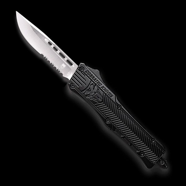 CobraTec CTK-1 D/A OTF Auto, 2.75" D2 Drop Serrated Blade, Aluminum Handle Black. CobraTec Black CTK-1 double action OTF Knife. The CTK-1 is one of the best out the front knife (OTF) for general use and a great choice as your everyday carry. The handle is designed from high-grade aluminum alloy and features a D2 steel blade. The knife is ambidextrous as the pocket clip can be switched to either side of the handle, depending on your preference. This OTF knife features a pocket clip, a glass breaker for emergencies and includes a nylon sheath. All CobraTec OTF knives are backed by our LIFETIME WARRANTY. 4.5 ounces Dual Action OTF 2.75 inch D2 Steel Blade 4.25 inch high-grade Aluminum Alloy handle 7 inches in total length with glass breaker