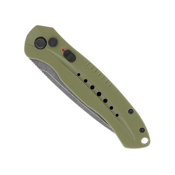 The Diablo push button automatic is a high-quality knife designed for precision and reliability. It features a rugged G10 handle that provides excellent grip and durability in various conditions. The blade is crafted from D2 steel, known for its exceptional edge retention and toughness, and it is finished with a black stonewash that not only enhances its appearance but also adds resistance to wear and corrosion. For added safety, this knife includes a sliding safety switch to prevent accidental discharge, ensuring that the blade only deploys when you intend it to. Whether you need a dependable tool for everyday carry or outdoor adventures, the Diablo delivers both performance and peace of mind. All CobraTec Knives are backed by our LIFETIME WARRANTY. Diablo Specifications: Side Switch Safety Switch to prevent accidental discharge Blade: D2 stonewashed Weight: 4 0z Blade Length: 3.5 inches Handle Length: 4.75 inches Overall Length: 8.25 inches