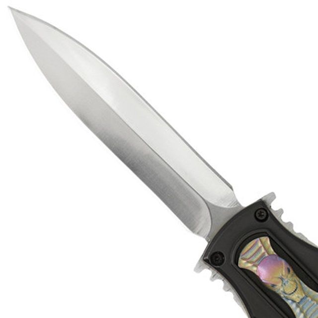 Critical Acclaim D/A OTF Knife with Skull Design and Pouch. Features: Blade Style: Spear Point Blade Material: Stainless Steel Handle Material: Cast Metal with Carbon Fiber Insert Color: Black with Titanium Blade Emergency Tool: Pointed Protrusion Sheath: Black Nylon Belt Sheath with Clip Closure Specifications: Overall Length: 9.5 Inches Blade Length: 4.4 Inches Blade Width: 1.2 Inches Blade Thickness: 2.75 mm Handle Length: 5.5 Inches Overall Width: 1.5 Inches