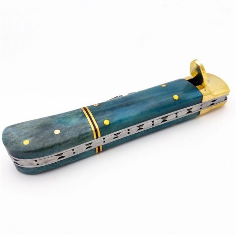 Damascus Blue Bone Leverlock Automatic Knife Clip Point. Overall Length: 9 Inches Blade Length: 4.25 Inches Blade Width: 0.78 Inch Blade Thickness: 3.12 mm Blade Style: Clip Point Blade Construction: Damascus steel, 15N20, 1095 High Carbon Handle Construction: Camel Bone Handle Length: 4.98 Inches Includes: Genuine Leather Sheath Features: Camel Bone Grips