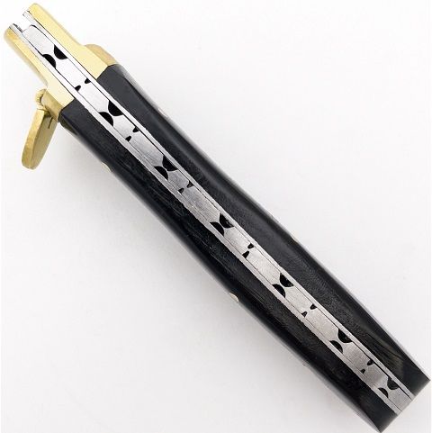 Damascus Buffalo Horn Leverlock Automatic Knife Clip Point. Overall Length: 9 Inches Blade Length: 4 Inches Blade Width: 0.75 Inch Blade Thickness: 3.02 mm Blade Style: Clip Point Blade Construction: Damascus Steel, 15N20, 1095 High Carbon Handle Construction: Buffalo Horn, Solid Brass Handle Length: 5.05 Inches Includes: Genuine Leather Sheath Features: Half circle pattern