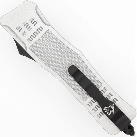 Delta Force Silver D/A OTF Automatic Knife Two Tone Drop Point Serrated Spine. Overall Length: 9.48 Inches Blade Length: 3.83 Inches Blade Width: 0.76 Inch Blade Thickness: 2.72 mm Blade Construction: Steel Handle Construction: Zinc Alloy Handle Length: 5.68 Inches Includes: Black Nylon Sheath