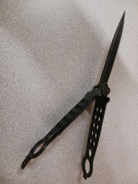 Flat Flipping Black Butterfly Knife Black Dagger. All metal handle 9.25 inches overall length, 4.25" double sided dagger blade. Comes with a pocket clip and belt sheath. 5.4 oz.