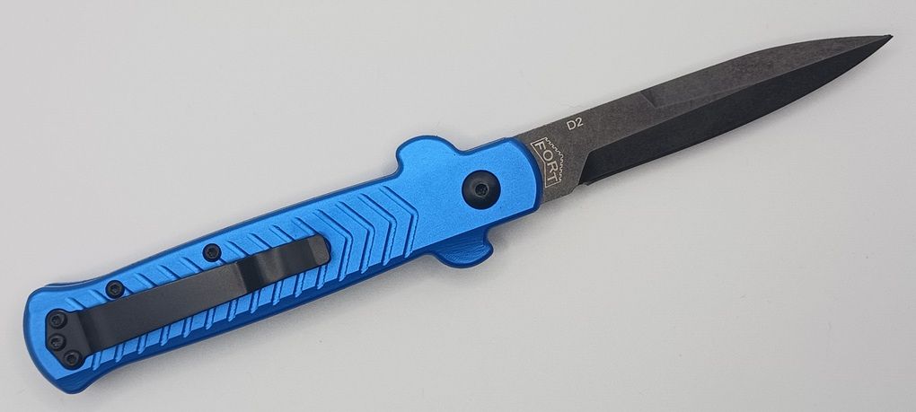 Fort Knife Works Arrow Blue Side Opening Automatic Knife D2 Stonewashed Bayonet. The Fort Knife Works Arrow has an 4.25" Anodized 6048 aluminum body. D-2 Steel 3.25" Blade with Pocket clip and a Strong Spring. 7.75" overall length. Also included is a Zippered pouch. This knife is a first production run and is built very well. It is CNC machined and has a super smooth hard snap when you open it.