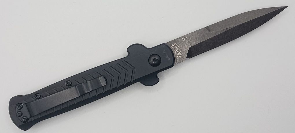 Fort Knife Works Black Arrow Side Open Automatic Knife D2 Black Bayonet. The Fort Knife Works Arrow has an 4.25" Anodized 6048 aluminum body. D-2 Steel 3.25" Blade with Pocket clip and a Strong Spring. 7.75" overall length. Also included is a Zippered pouch. This knife is a first production run and is built very well. It is CNC machined and has a super smooth hard snap when you open it.
