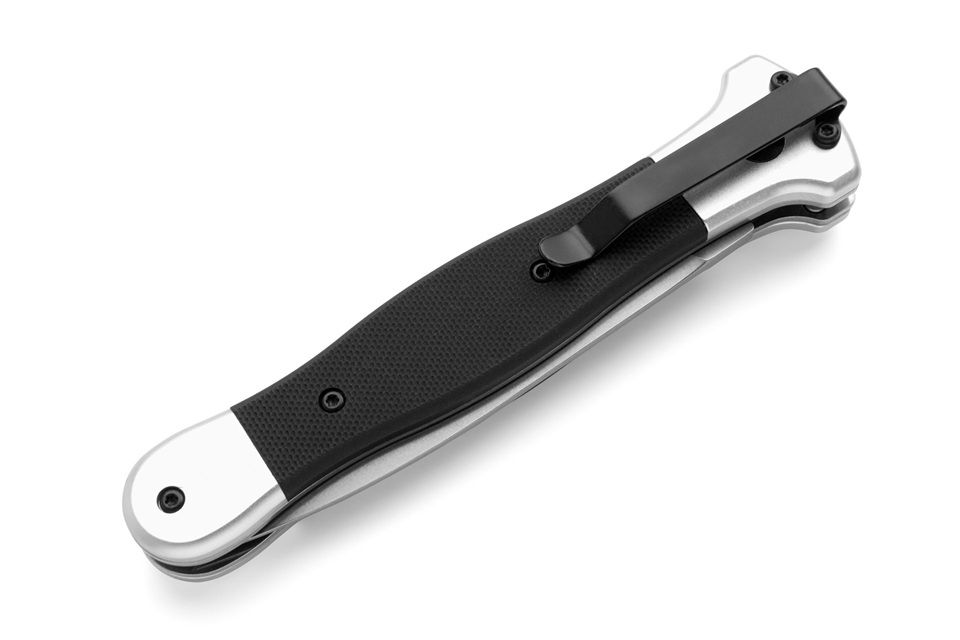 Fort Knife Works Black G-10 Cross Side Opener Automatic Knife Satin Dagger (8.5" Overall). Fort Knife Works – The Cross Auto Side Opener The Cross is a sleek, side-opening automatic knife designed for everyday carry and tactical use. It features a stonewashed M390 dagger blade, lightweight aluminum handle and a lightning-fast push-button action. A built-in safety lock prevents accidental deployment. Compact, powerful, and reliable—The Cross is built to perform wherever you are. Overall Length: 21.5cm - 8.5" Blade Length: 9.1cm - 3.6" Weight: 132gr - 4.6oz Blade Material: M390 Handle Material: G10