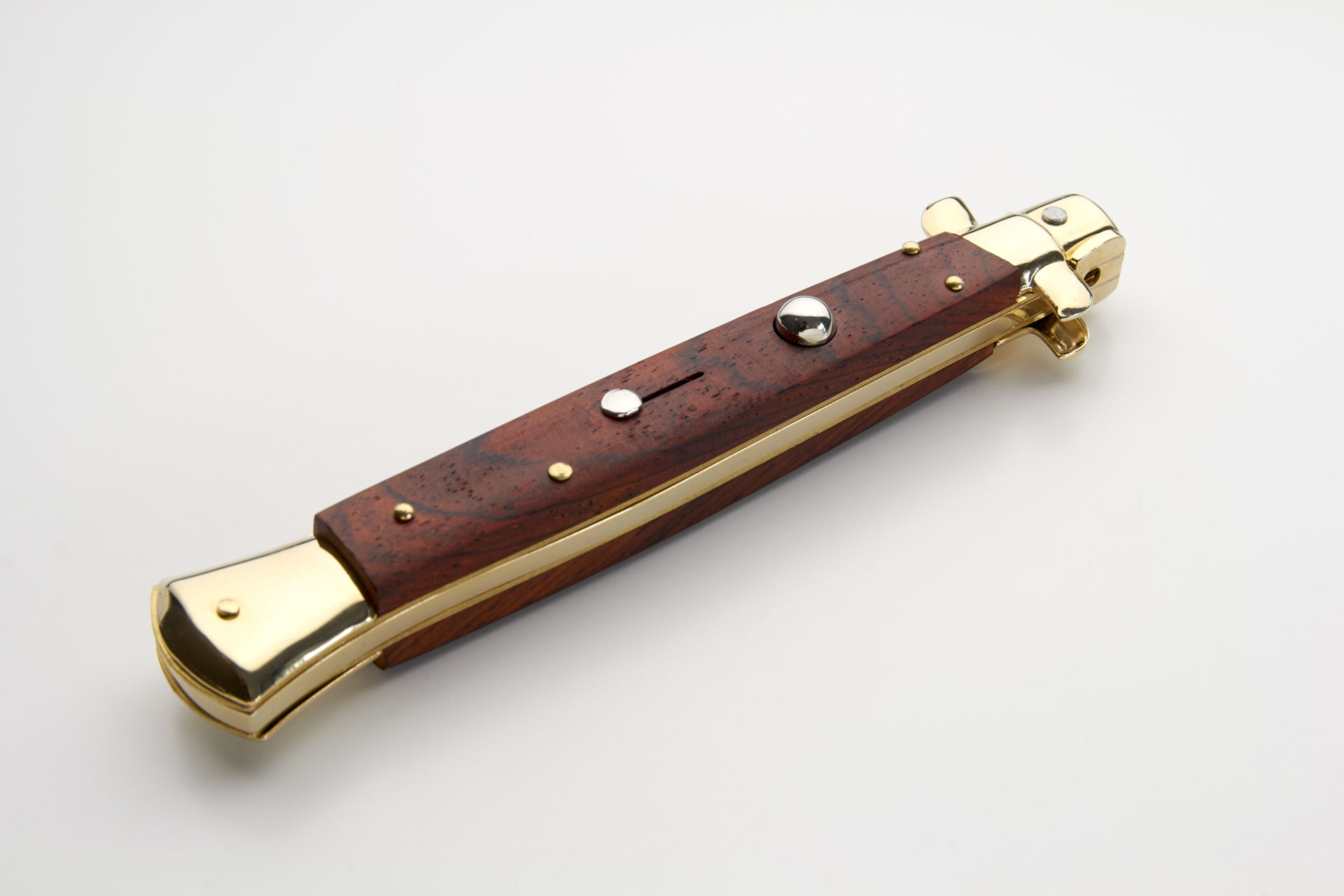 Frank Beltrame 11" Cocobolo Wood Italian Stiletto Automatic Knife Gold Bayo. Overall Length: 28cm -11" Blade Length: 12,5cm - 5" Blade thickness: 3mm - 0,12" Weight: 140 gr Blade material: AISI 420 Stainless steel Handle material: Rosewood Frame material: Brass Made in: Italy