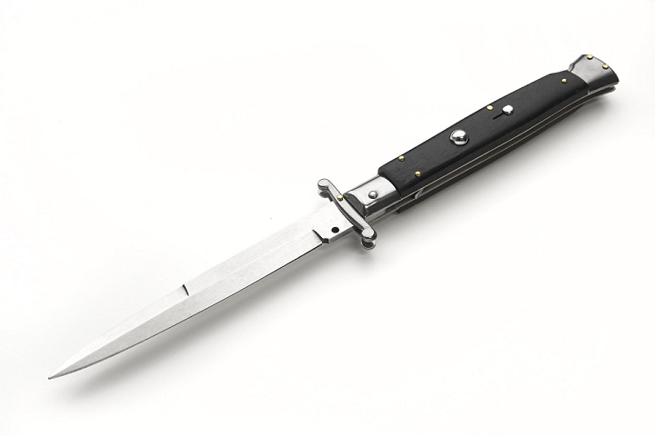 Frank Beltrame 11" Swinguard Stiletto Automatic Knife Ebony Wood Bayo 4mm. New from italy, they have changed to 4mm from 3.5mm. From now on all knives will have 4mm blade and springs. If you have any 3.5" models they are now collectors items. Overall Length: 28cm - 11" Blade Length: 12cm - 5" Blade thickness: 4mm Blade material: AISI 420 Stainless steel Handle material: Ebony Wood Frame material: Stainless steel Made in: Italy.