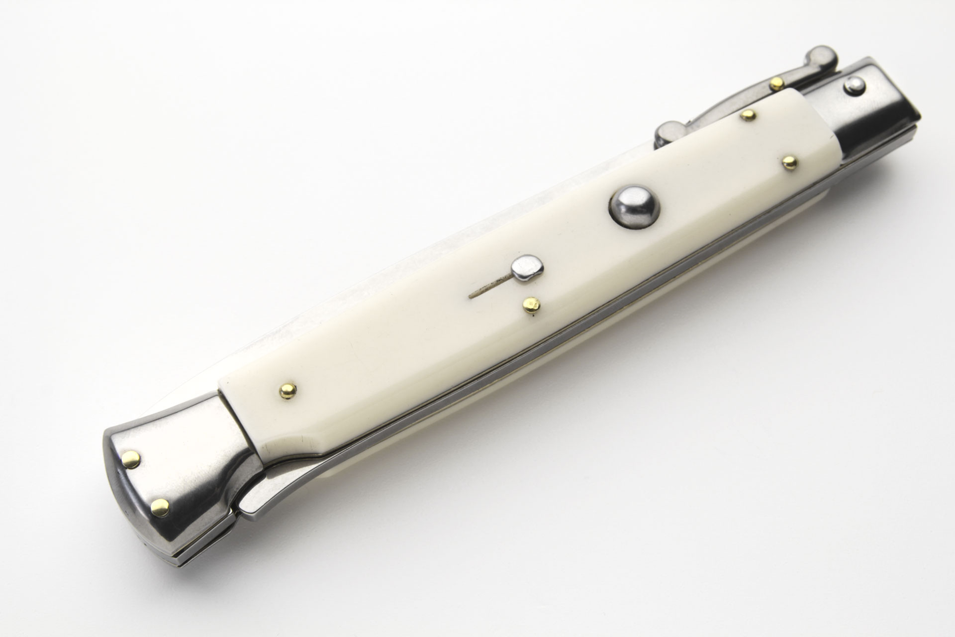 Frank Beltrame 11" Swinguard Stiletto Automatic Knife Imitation Ivory Dagger. Overall Length: 28cm - 11" Blade Length: 12cm - 5" Blade thickness: 3,5mm - 0.14" Weight: 145 grBlade material: AISI 420 Stainless steel Handle material: Imitation ivory Frame material: Stainless steel Made in: Italy