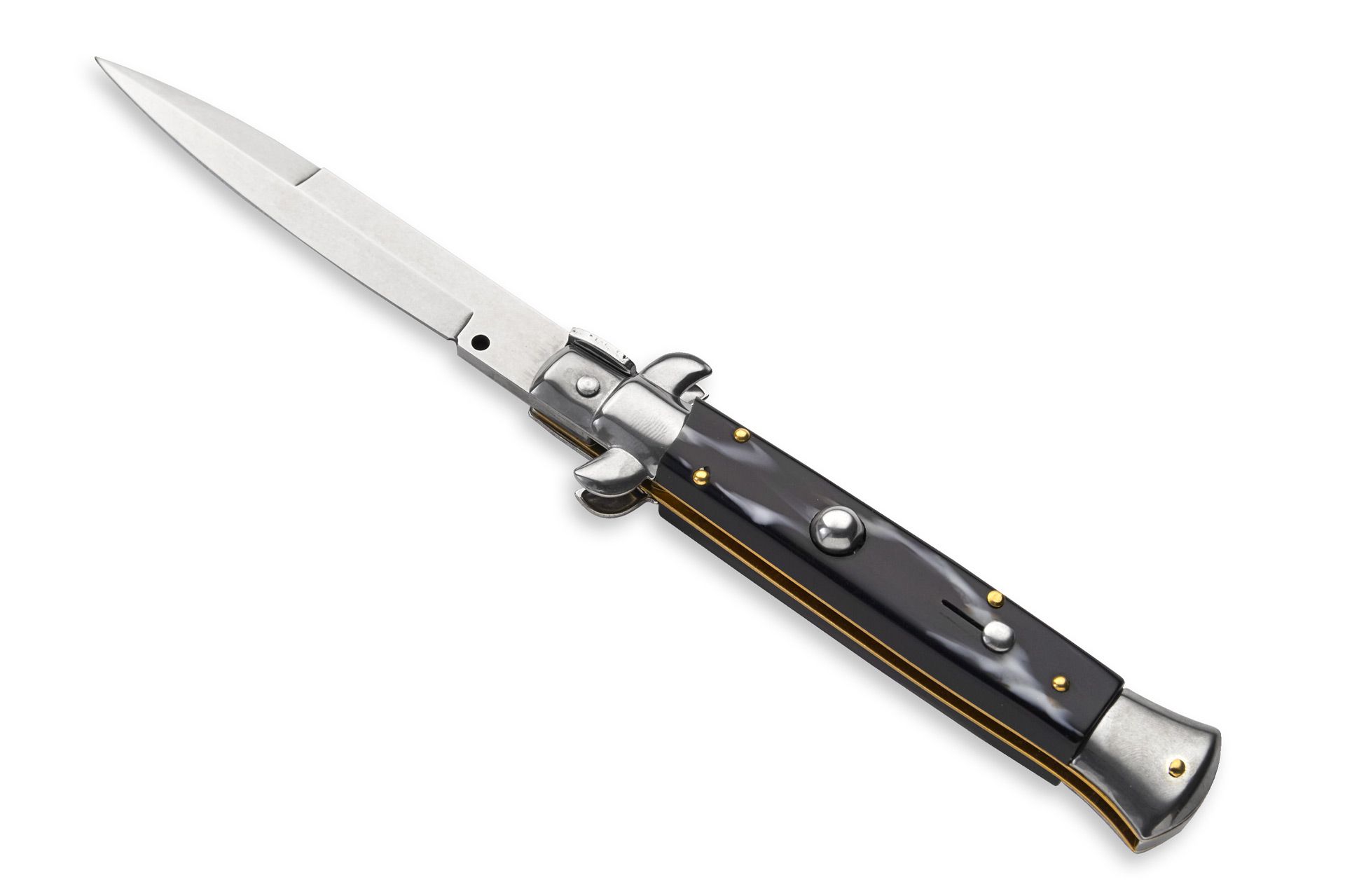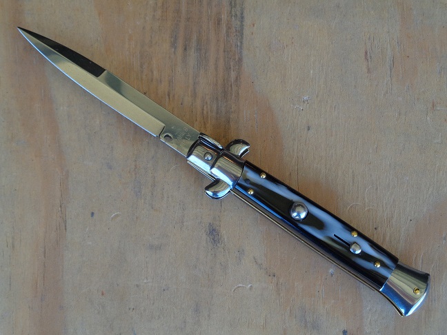 Frank Beltrame 9" Imitation Horn Stiletto Automatic Knife Polished Bayonet. Overall Length: 23cm - 9" Blade Length: 10cm - 4" Blade thickness: 3mm - 0.12" Weight: 110gr - 3.8ozBlade material: AISI 420 Stainless Steel Handle material: Imitation Horn Frame material: Stainless Steel Made in: Italy