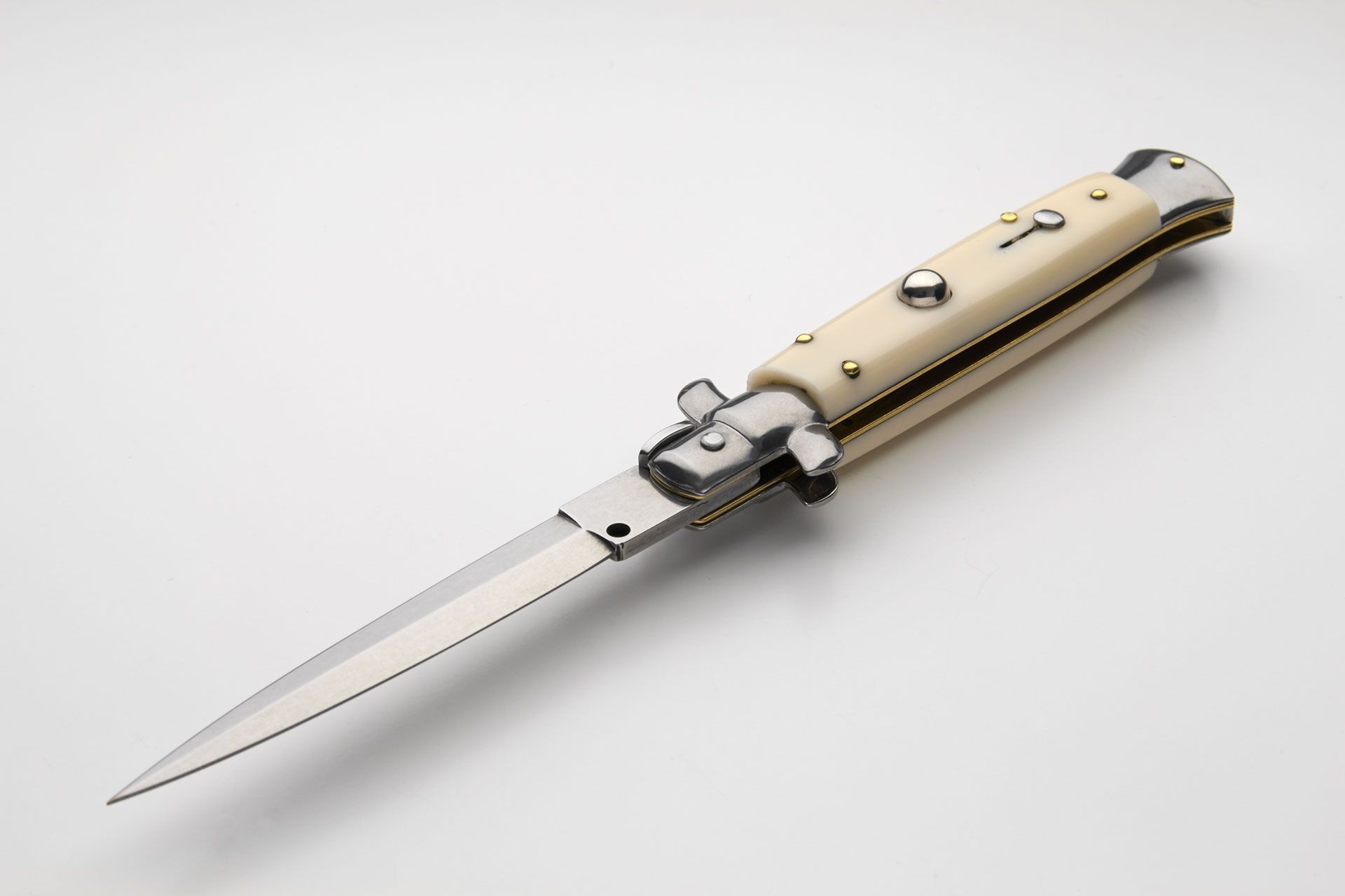 Frank Beltrame 9" Imitation Ivory Stiletto Automatic Knife Dagger. Straight from Italy, all hand made knives. 4 inch blade 440 stainless steel stamped frank b Italy on tang. Put together with brass pins and comes with a safety switch.