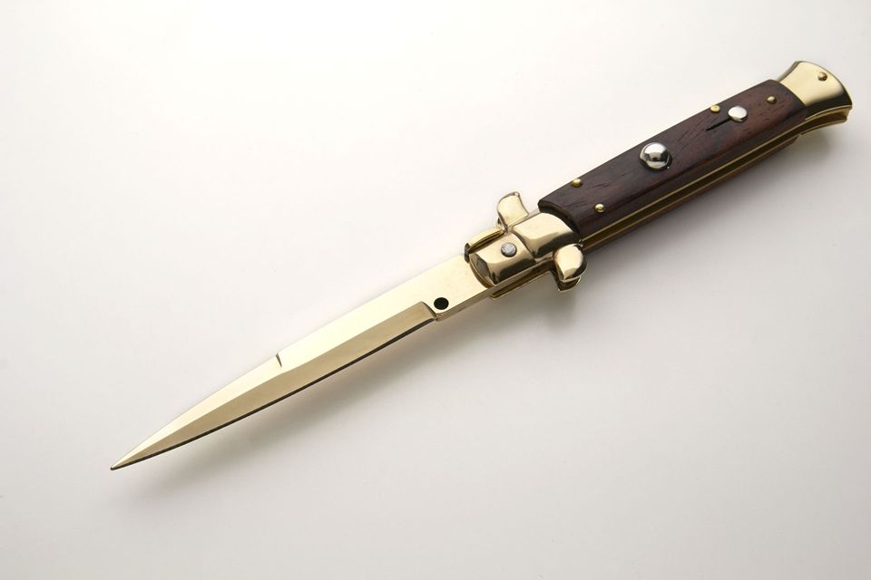 A beauty for who like the luxury. A classic 9" stiletto made by Frank Beltrame.Genuine red heart wood scales and bayonet blade. All parts are gold plated .The STILETTO classic. Always sexy, always attractive. Made in Italy by Frank Beltrame. Stainless steel bolsters release. Slide safety and very well made. Note: as it is a natural material, color, texture and pattern will vary from knife to knife. Overall Length: 23cm - 9" Blade Length: 10cm - 4" Blade thickness: 3mm - 0.12" Weight: 115 gr Blade material: AISI 420 Stainless steel Handle material: Red Heart wood Frame material: Stainless steel Made in: Italy