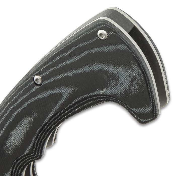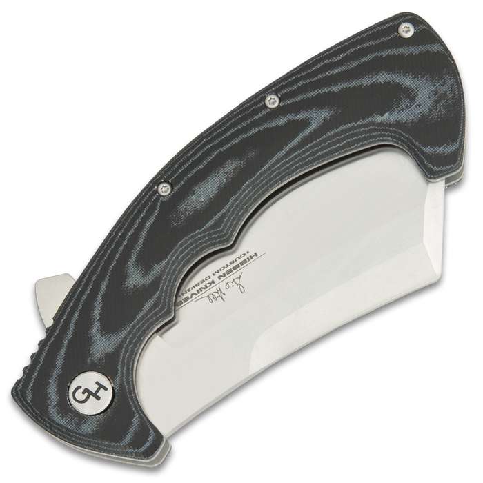 Gil Hibben Folding Cleaver Knife Micarta. The Gil Hibben Folding Cleaver Knife puts the incredible chopping power of a full-size cleaver right in your pocket The knife has a 3 7/8” 7Cr17 stainless steel cleaver blade, with a satin finish, which can be easily accessed with its flipper The handle scales are crafted of black Micarta, secured with sturdy screws, and the liners are bead blasted stainless steel The pocket knife has a bead-blasted stainless steel pocket clip and is 5”, when closed, and it is 8 7/8” in overall length