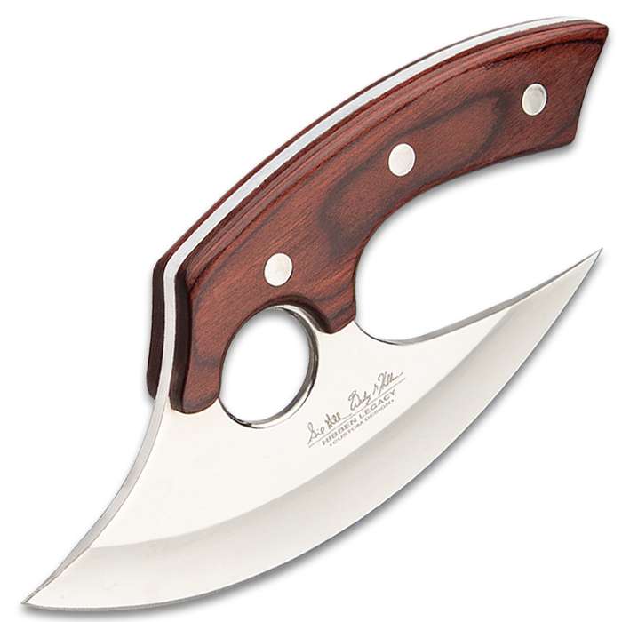 Knife Masters Gil and Wes Hibben continue to put out innovative designs, which become legends in their own right The 6 1/2” 5Cr15 stainless steel blade has a mirror polished finish and is wide and beefy to tackle any cutting task in front of it The handle scales are an attractive reddish wooden and solid stainless steel pins secure the comfortable grip to the blade The ulu knife is protected by a black leather belt sheath with an embossed Hibben logo and a secure snap closure The sleek and modern ulu knife has an overall length of 7 5/8”