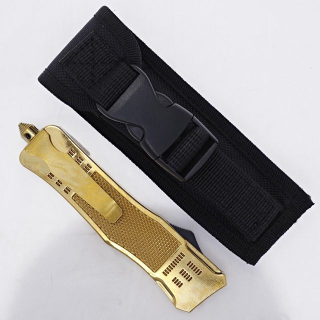 A tactical knife that stands out with its striking golden aluminum handle and practical design. Perfect for resale or bulk purchase, this Golden OTF Knife is equipped with a stainless steel partially serrated blade and automatic deployment for quick use. Comes complete with a durable nylon sheath for safe carry. Specifications: Overall Length: 8.5 inches Blade Length: 3.5 inches Blade Material: Stainless Steel (partially serrated) Handle Material: Golden Aluminum Mechanism: OTF Automatic Deployment Sheath: Black Nylon Features: Eye-catching golden aluminum handle Partially serrated edge for multipurpose cutting Reliable OTF automatic mechanism Includes a durable nylon sheath with belt loop