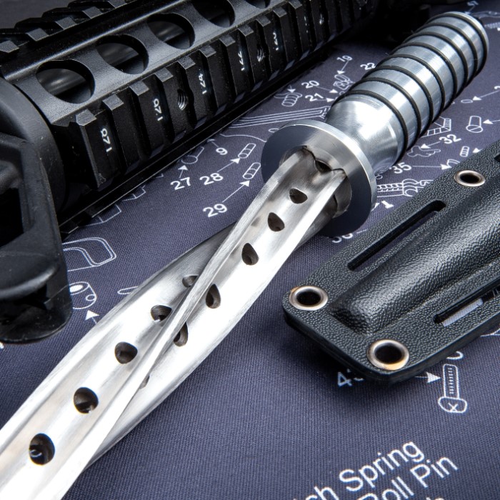 Grey Titanium Spiral Dagger Knife. A spiraling triumph of design, this quad-edged dagger is a powerful ally whenever things get down and really dirty It has a 11 1/2” grey titanium-coated, stainless steel, quad-edged blade with thru-holes and it spirals down to a piercing point The stainless steel handle has TPR rings to give you a slip-free grip and there is a hidden compartment in the pommel The 16 1/2” overall quad-edged knife comes in a custom-fit, tough TPU belt sheath, which also has steel lashing holes