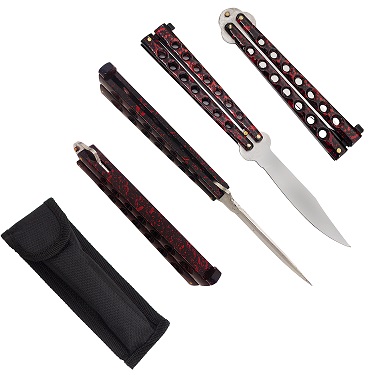 The heavy weight butterfly knives are heavier than your normal low cost butterfly knife. These weigh 5.9 oz with a blade length of 4 inches and a total overall length of 9 inches. Very little wobble if any on these, very tightly put together. Comes with a belt sheath! Made in Taiwan