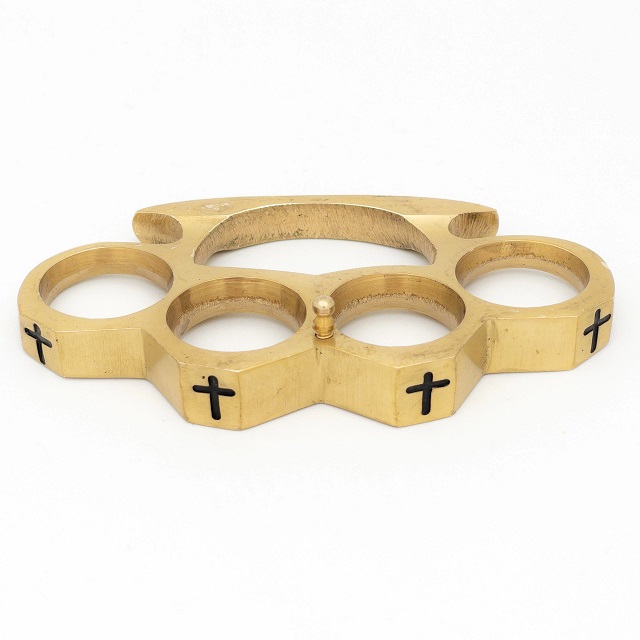 Holy Cross Brass Knuckles Paperweight Duster. These knuckle dusters are made from 100% pure brass. Black crosses are deeply engraved into the knuckles. Overall Length: 2.5 inches, Overall Width: 4.35 inches