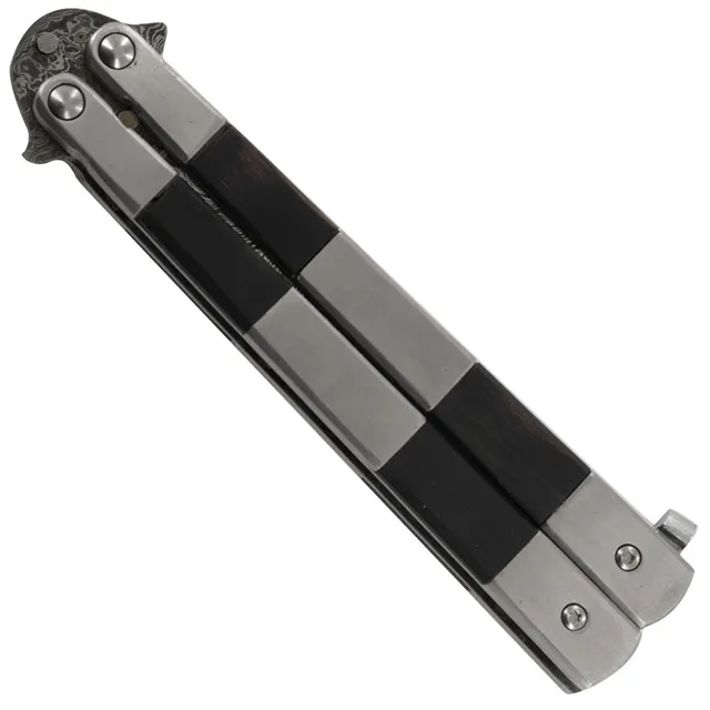 Horror Show Damascus Steel Heavy Duty Fanning Butterfly Knife. Damascus steel is characterized by distinctive patterns of banding and mottling reminiscent of flowing water. Not only is it beautiful, but it is also valued because of its ability to maintain a keen edge yet is also hard and flexible. The blade of this particular butterfly knife is made from Damascus steel in a drop point style. It’s made from 1095/15N20 alloy steel. A billet is forged, hammered, and heated so that a pattern shows on the blade. The HRC is around 54 to 55 with 180 true blade layers. This knife also features double tang pins meant to hold the blade away from the handle when closed to prevent dulling and another pin to keep the handles from excessively banging together while the butterfly knife is being manipulated. This eye-catching blade is a very unique piece to your collection. Overall Length: 8.75 Inches, Blade Length: 4 Inches