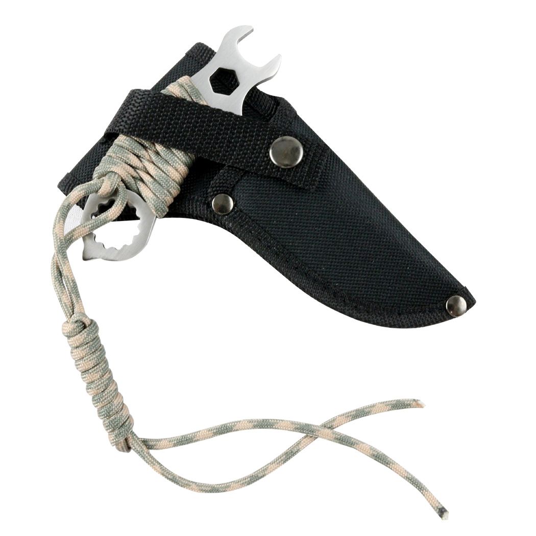 Hunt Down 5 Inch Palm Push Dagger Knife Camo Cord. Any blade becomes a survival blade when you're in over your head, but some are better suited to the task than others. Whether you're a hard-core bushcrafter, a weekend camper, or in a real emergency situation, this survival knife will make your time out there much more enjoyable. In certain cases, you may need a tool that will do things you never thought you would ask of it. Our survival knife is designed with a rugged durability and a no-nonsense functionality for these situations. Overall Length: 5" Blade Length: 4" Stainless Steel Chrome Blade Curved Handle Green & Tan Cord Wrapped Handle Black Sheath Included