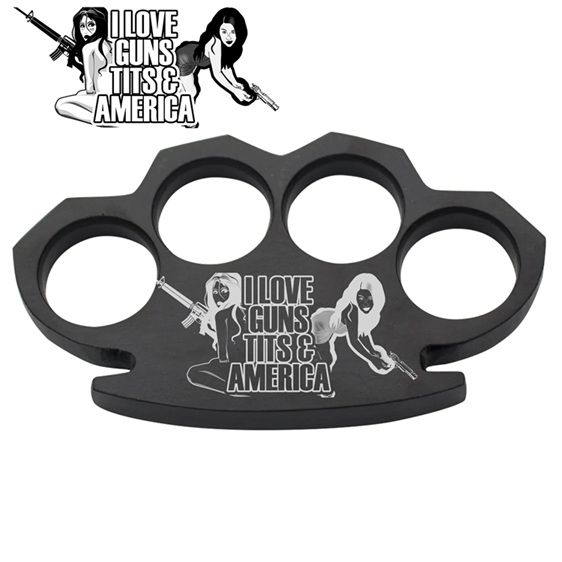 I Love Guns T-ts and America Steam Punk Black Solid Metal Paper Weight. Product Features Weighs in at 10 Ounces Length: 4.5" Width: 2.75" 0.5 an inch of thickness Solid Black Steel with engraving Product Description This item is made of solid Black Steel. This item has a overall length of 5 inches and a width of 3 inches. It has a black smooth matte finish. Huge holes with a diameter of an inch.
