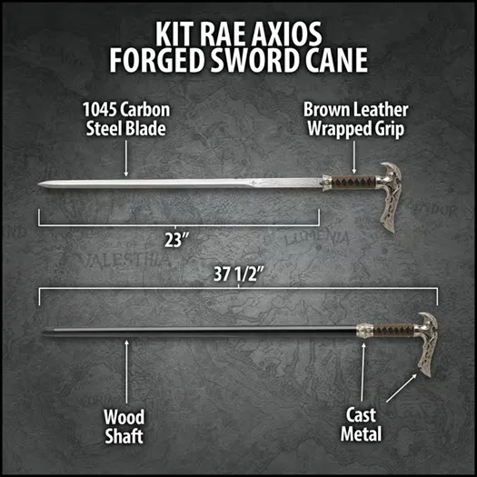 The Kit Rae Axios Forged Sword Cane is a stunning fusion of artistry and design, featuring intricate scrollwork etchings and scrupulous detailing on its hidden blade. Created for collectors and enthusiasts, this elegant piece houses a 23” 1045 carbon steel blade, seamlessly concealed within a sturdy wooden shaft. The cast metal handle, wrapped in faux leather, adds a touch of refinement while ensuring a comfortable and secure grip. Designed with both aesthetics and intrigue in mind, the hidden blade locks securely into the shaft and releases smoothly with a concealed button mechanism. The hard rubber toe at the base enhances its seamless look, making it a striking display piece that also commands attention when carried. Whether showcased in a collection or wielded as a statement accessory, the Axios Forged Sword Cane embodies Kit Rae’s signature blend of fantasy and craftsmanship. EXCEPTIONAL DESIGN: Features scrupulous details and intricate scrollwork etchings on the blade for a refined aesthetic. HIDDEN STEEL BLADE: The 23” 1045 carbon steel blade is expertly concealed within the cane for a sleek, seamless look. STYLISH HANDLE: The cast metal handle with faux leather wrappings offers a distinguished and comfortable grip. ELEGANT WOODEN SHAFT: A polished wooden shaft with a hard rubber toe enhances the cane’s sophisticated appeal. SEAMLESS LOCKING MECHANISM: The blade locks securely and releases effortlessly with a discreet button mechanism.