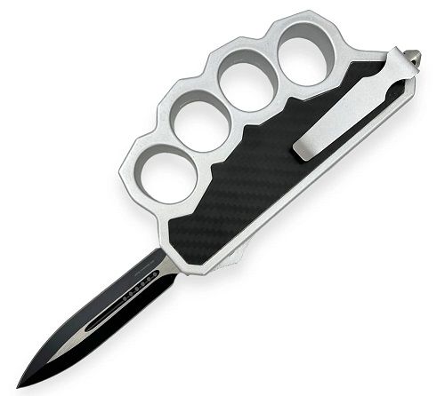 Knuckle OTF Trench Knife Stainless D/A Automatic Two Tone Dagger. Weighs 7.65 oz. 9.5 inches overall length. - 5.5 inch long handle. 3.5 inch blade length width 2.75 inch Free Nylon Sheath carbon fiber handle inserts