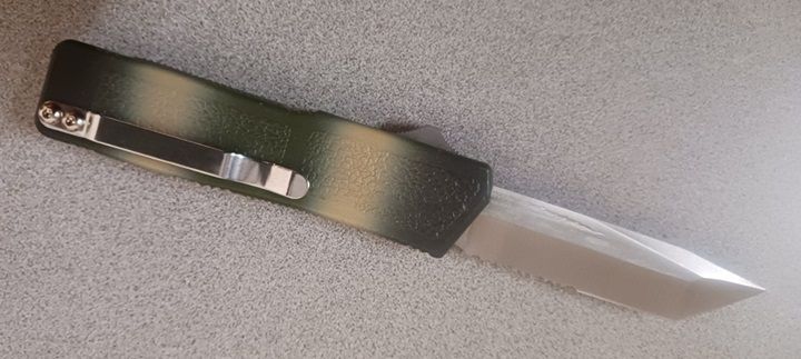 Lightning Camo D/A OTF Automatic Knife Tanto Serrated. Dual Action 440 stainless steel 3.25 inch blade with a pocket clip on the side of the 4.75 Inch handle. This lightning is better than the lightning elites. It has an aluminum handle and better blade material. 8 inches overall length with strong spring action. This knife is made in taiwan.
