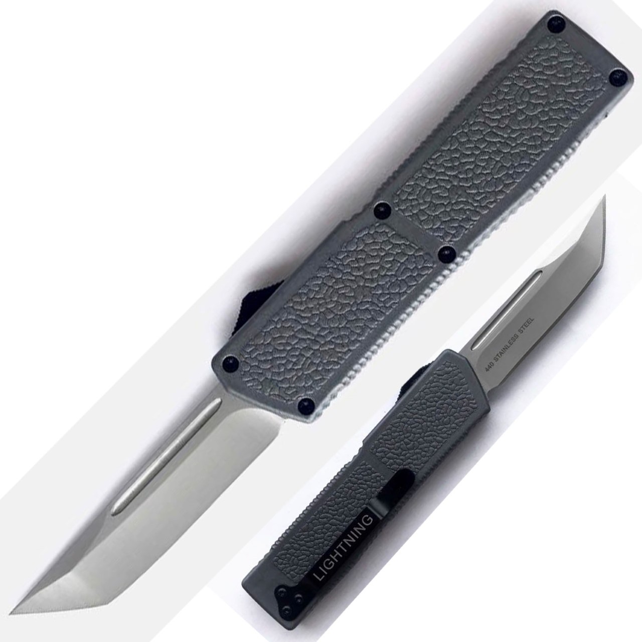 Lightning Model 2 Gray D/A OTF Automatic Knife Satin Tanto. Aerospace Grade Aircraft Aluminum Handle 440 Stainless Steel Blade Deep Carry Pocket Clip. 8 inch total length 3.25 inch blade. Strong spring dual action snap with the push of the button forward and backward