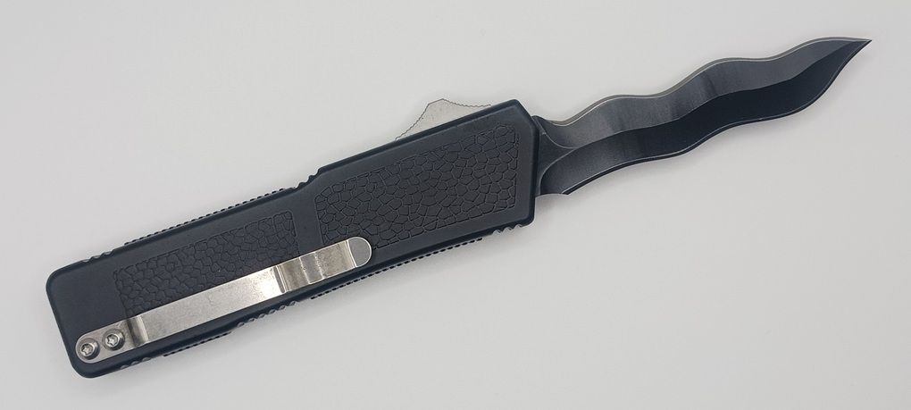 Lightning Supreme Black D/A OTF Automatic Knife Black Kriss. The Black Lightning Supreme has an 8 inch total length with a 3.25 inch blade. It is a double action in and out switchblade knife. This is a taiwan version. The taiwan version was the first produced before the chinese versions came out. This version has aircraft aluminum handles and better made metal blades. The springs in these are made better and stronger than the chinese versions. It comes with a pocket clip which can be taken off.
