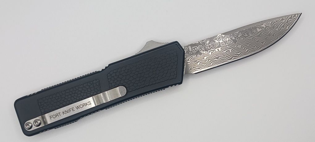 Lightning Supreme Black D/A OTF Automatic Knife Damascus Drop Point. The Black Lightning Supreme has an 8 inch total length with a 3.25 inch blade. It is a double action in and out switchblade knife. This is a taiwan version. The taiwan version was the first produced before the chinese versions came out. This version has aircraft aluminum handles and better made metal blades. The springs in these are made better and stronger than the chinese versions. It comes with a pocket clip which can be taken off.