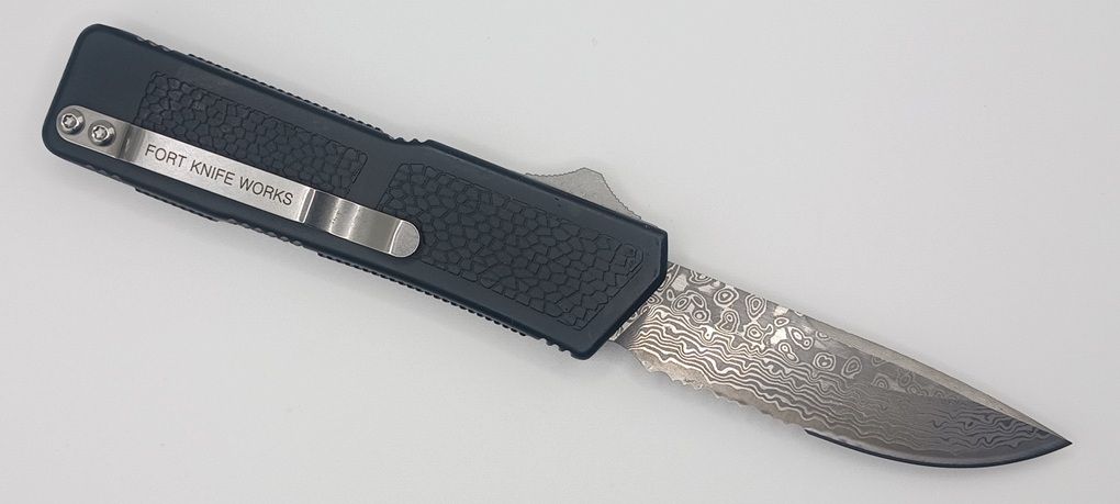 Lightning Supreme Black D/A OTF Automatic Knife Damascus Drop Point Serrated. The Black Lightning Supreme has an 8 inch total length with a 3.25 inch blade. It is a double action in and out switchblade knife. This is a taiwan version. The taiwan version was the first produced before the chinese versions came out. This version has aircraft aluminum handles and better made metal blades. The springs in these are made better and stronger than the chinese versions. It comes with a pocket clip which can be taken off.