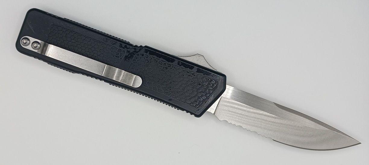 Lightning Supreme Black D/A OTF Automatic Knife Drop Point Satin Serrated. The Black Lightning Supreme has an 8 inch total length with a 3.25 inch blade. It is a double action in and out switchblade knife. This is a taiwan version. The taiwan version was the first produced before the chinese versions came out. This version has aircraft aluminum handles and better made metal blades. The springs in these are made better than the chinese versions. It comes with a pocket clip which can be taken off.