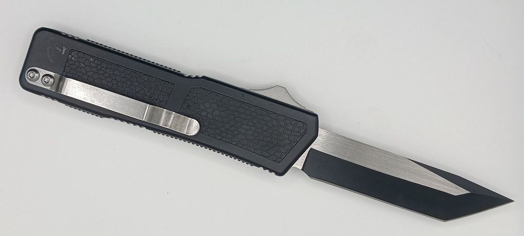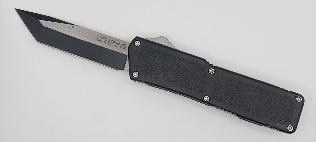 Lightning Supreme Black D/A OTF Automatic Knife Tanto Point Two Tone Plain. The Black Lightning Supreme has an 8 inch total length with a 3.25 inch blade. It is a double action in and out switchblade knife. This is a taiwan version. The taiwan version was the first produced before the chinese versions came out. This version has aircraft aluminum handles and better made metal blades. The springs in these are made better than the chinese versions. It comes with a pocket clip which can be taken off.