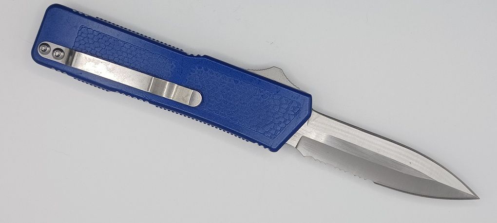 Lightning Supreme Blue D/A OTF Automatic Knife Dagger Point Satin Serrated. The Blue Lightning Supreme has an 8 inch total length with a 3.25 inch blade. It is a double action in and out switchblade knife. This is a taiwan version. The taiwan version was the first produced before the chinese versions came out. This version has aircraft aluminum handles and better made metal blades. The springs in these are made better than the chinese versions. It comes with a pocket clip which can be taken off.