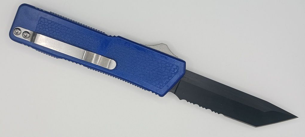 Lightning Supreme Blue D/A OTF Automatic Knife Tanto Point Black Serrated. The Blue Lightning Supreme has an 8 inch total length with a 3.25 inch blade. It is a double action in and out switchblade knife. This is a taiwan version. The taiwan version was the first produced before the chinese versions came out. This version has aircraft aluminum handles and better made metal blades. The springs in these are made better than the chinese versions. It comes with a pocket clip which can be taken off.